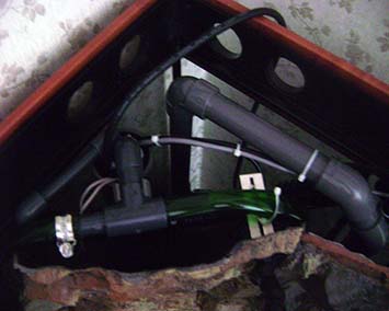 gesteuert über den ProfiLux Computer. Ebenso wird ein MP3-Verstärker für Blitz-und Donnergeräusche angesteuert, während im Becken die Blitze zucken. Für besondere Situationen kann ich bedarfsweise einen UV-C Wasserklärer zuschalten. Der Wasserkreislauf wird weitestgehend durch eine feste Verrohrung mit PVC-U Rohren bewerkstelligt. Durch eine 55mm Bohrung im Aquarium wird das Wasser in den Unterschrank geleitet. Eine Überlaufkammer in der Ecke des Beckens sorgt für Sicherheit,