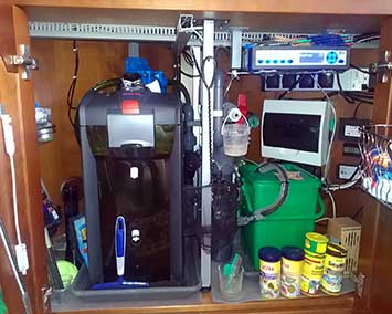 Das Becken wird weitgehend von einem Computer gesteuert. Hierfür wurde ein GHL ProfiLux angeschafft. Neben den Wassersensoren für PH, Temperatur, Redox und Niveauüberwachung steuert der Computer die gesamte Beleuchtung incl. Simulation von Wettersituationen, Sonnenaufgang, Mondlicht usw. Die Programmierung erfolgt drahtlos per WLAN vom PC bzw. Notebook aus, wobei auch alle Messwerte überwacht werden können. Über das Internet kann ich auch aus der Ferne auf den Profilux zugreifen,