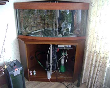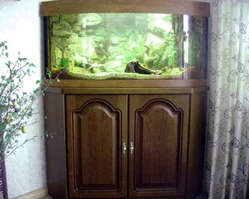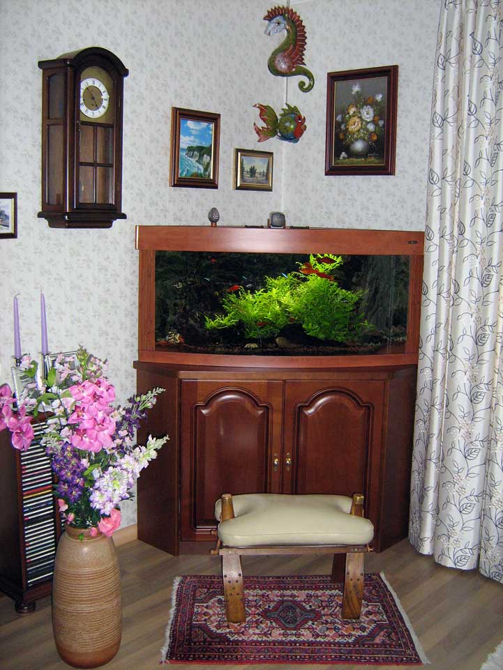 Ein Eckaquarium soll im Wohnzimmer einen freien Platz verschönern. Da die Standard-Aquarien mit Unterschrank leider nicht zu den vorhandenen Möbeln passen, wurde eine individuelle Lösung angestrebt.